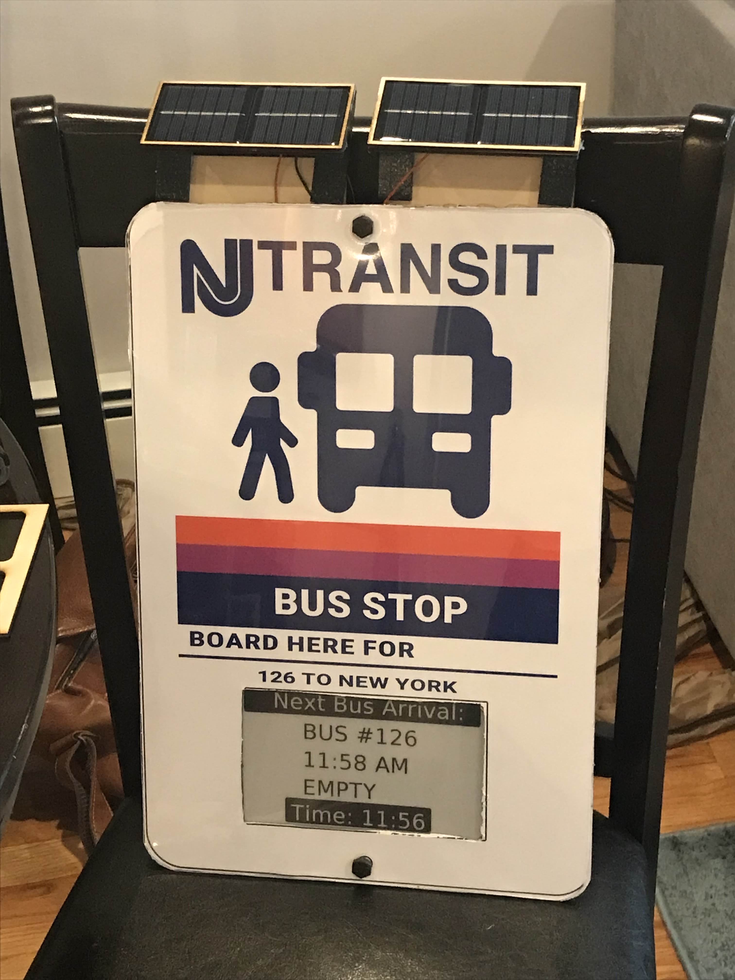 eStop is a LoRa-connected e-ink transit display system developed to provide real-time bus arrival information, occupancy data, and synchronized time display in a low-power format. The system was designed to operate either as a standalone sign with onboard connectivity or as part of a distributed network linked to a bus-mounted communications node. By pairing long-range communication with a highly efficient display, the project explores a practical approach to improving transit visibility while minimizing infrastructure and power demands.